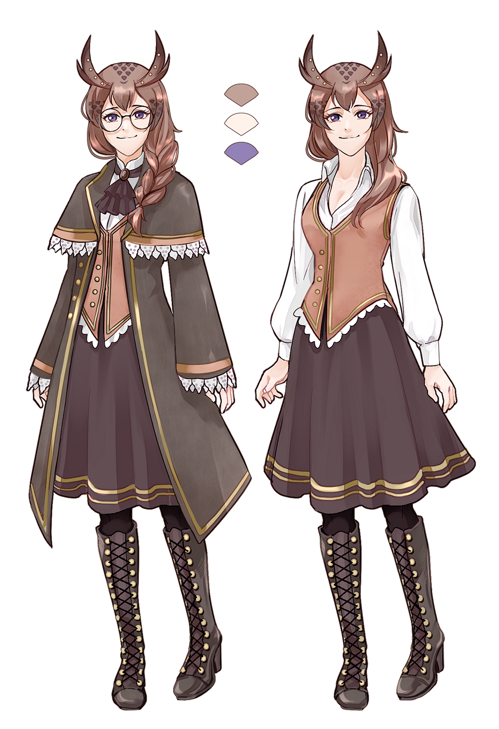A form taken by Eddy in an attempt to assimilate into civilization, Eddy, in many ways, prefers her appearance to be rather unassuming, many of her features becoming simpler and even donning a pair of fake glasses to make herself less imposing. In many ways, despite her attempts to avoid attention, her features and choice of clothing still tend to make her stand out a bit more than others, though she cares little of this is she can brush it off and call herself a simple enigma while in public.